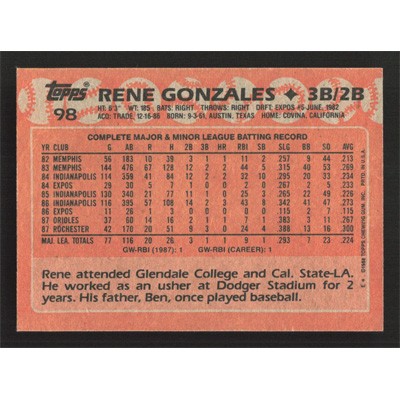 This is a 1988 Topps Rene Gonzales baseball card. The card is #98 and pictures show condition.