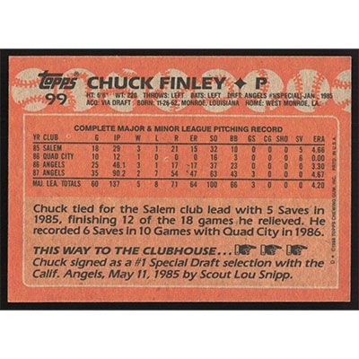 This is a 1988 Topps Chuck Finley baseball card. The card is #99 and pictures show condition.