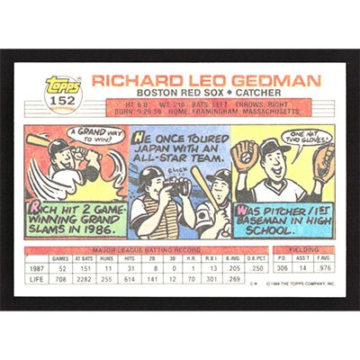 This is a 1988 Topps Big Rich Gedman baseball card. The card is #152 and pictures show condition.