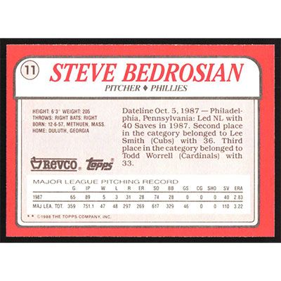 This is a 1988 Topps Revco League Leaders Steve Bedrosian baseball card. The card is #11 and pictures show condition.