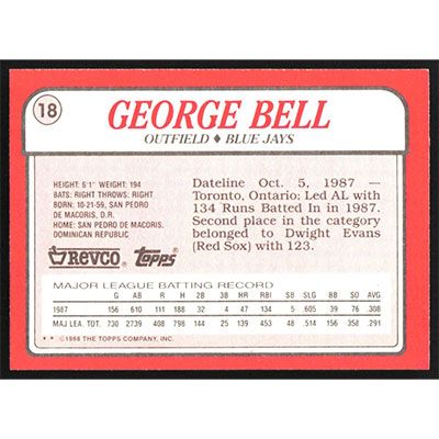 This is a 1988 Topps Revco League Leaders George Bell baseball card. The card is #18 and pictures show condition.