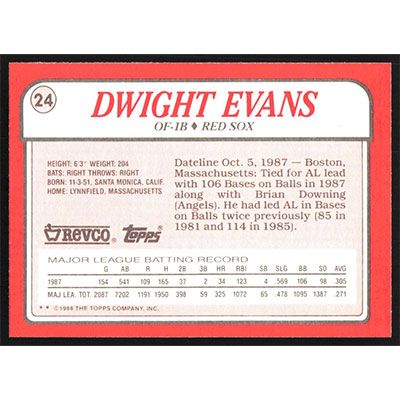 This is a 1988 Topps Revco League Leaders Dwight Evans baseball card. The card is #24 and pictures show condition.
