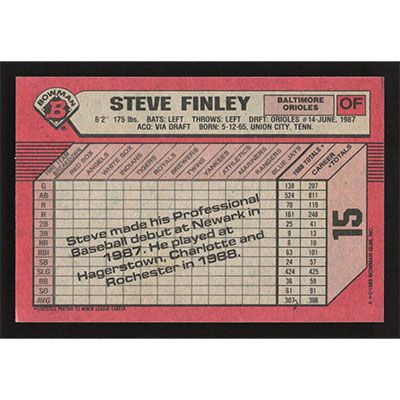 This is a 1989 Bowman Steve Finley baseball card. The card is #15 and pictures show condition.