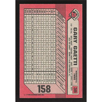 This is a 1989 Bowman Gary Gaetti baseball card. The card is #158 and pictures show condition.