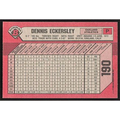 This is a 1989 Bowman Dennis Eckersley baseball card. The card is #190 and pictures show condition.