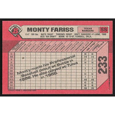 This is a 1989 Bowman Monty Fariss baseball card. The card is #233 and pictures show condition.