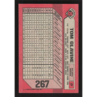 This is a 1989 Bowman Tom Glavine baseball card. The card is #267 and pictures show condition.