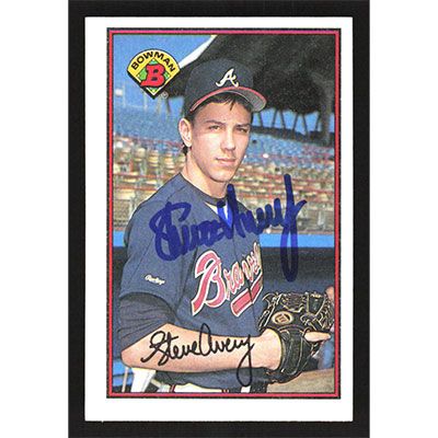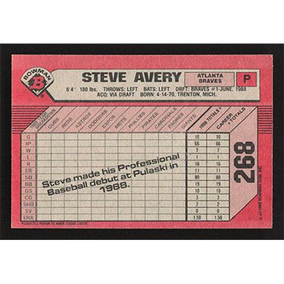 This is a 1989 Bowman Steve Avery autographed baseball card. This card has been signed, in blue, by Steve Avery, and is guaranteed authentic by Ballcardz.com. The card is #268 and pictures show condition.