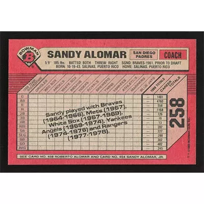 This is a 1989 Bowman Sandy Alomar/Roberto Alomar/Sandy Alomar Jr. baseball card. The card is #458 and pictures show condition.