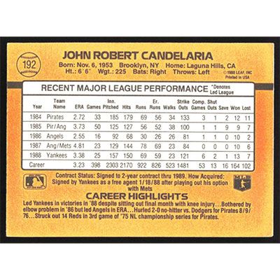 This is a 1989 Donruss John Candelaria baseball card. The card is #192 and pictures show condition.