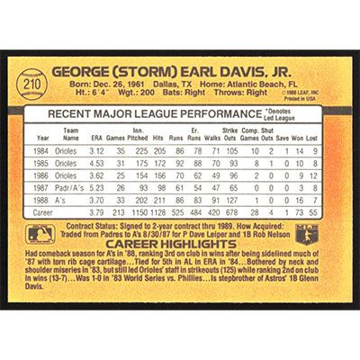 This is a 1989 Donruss Storm Davis baseball card. The card is #210 and pictures show condition.