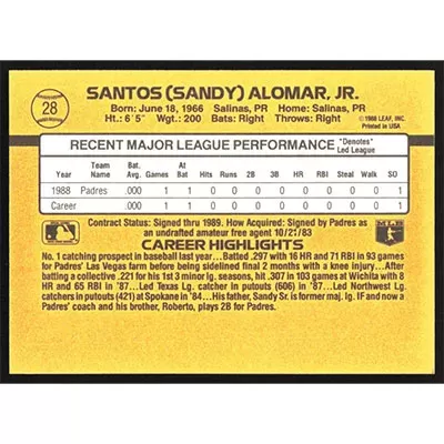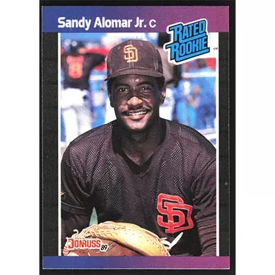 This is a 1989 Donruss Sandy Alomar Jr. Rated Rookie baseball card. The card is #28 and pictures show condition. Team(s): San Diego Padres Rookie Card (RC)