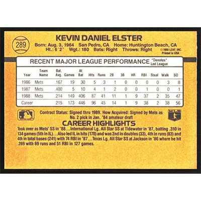 This is a 1989 Donruss Kevin Elster baseball card. The card is #289 and pictures show condition.