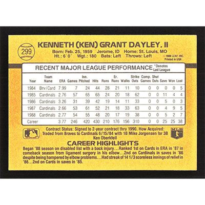 This is a 1989 Donruss Ken Dayley baseball card. The card is #299 and pictures show condition.