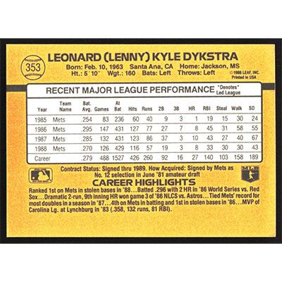 This is a 1989 Donruss Lenny Dykstra baseball card. The card is #353 and pictures show condition.