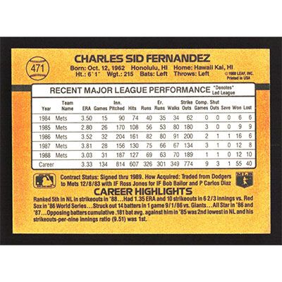 This is a 1989 Donruss Sid Fernandez baseball card. The card is #471 and pictures show condition.