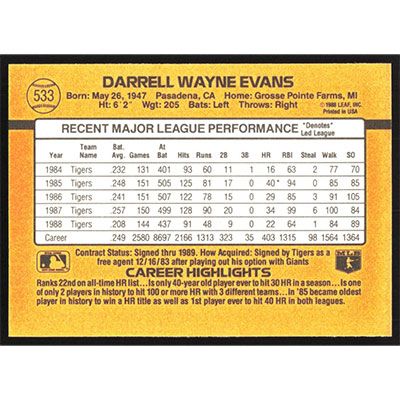 This is a 1989 Donruss Darrell Evans baseball card. The card is #533 and pictures show condition.