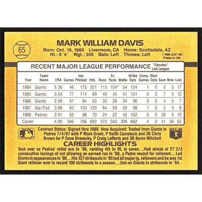 This is a 1989 Donruss Mark Davis baseball card. The card is #65 and pictures show condition.