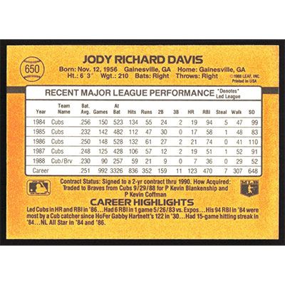 This is a 1989 Donruss Jody Davis baseball card. The card is #650 and pictures show condition.