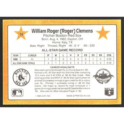This is a 1989 Donruss All-Stars Roger Clemens baseball card. The card is #14 and pictures show condition.