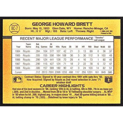 This is a 1989 Donruss Bonus MVPs George Brett baseball card. The card is #BC-7 and pictures show condition.
