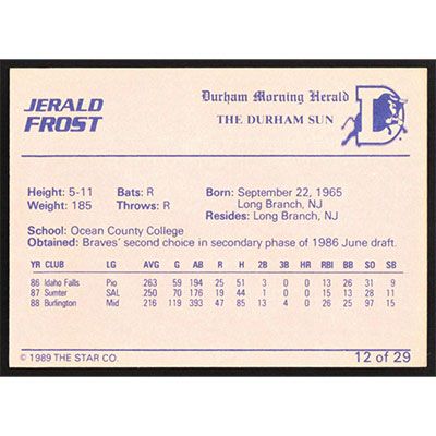 This is a 1989 Durham Bulls Star I Jerald Frost baseball card. The card is #12 and pictures show condition.