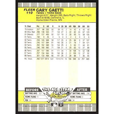 This is a 1989 Fleer Gary Gaetti baseball card. The card is #110 and pictures show condition.