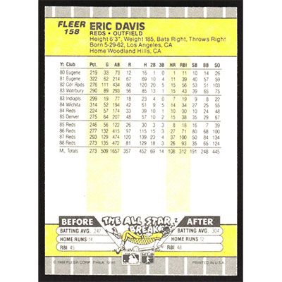 This is a 1989 Fleer Eric Davis baseball card. The card is #158 and pictures show condition.