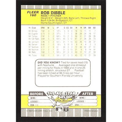 This is a 1989 Fleer Rob Dibble baseball card. The card is #160 and pictures show condition.