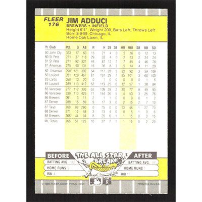 This is a 1989 Fleer Jim Adduci baseball card. The card is #176 and pictures show condition.