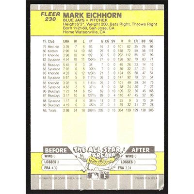 This is a 1989 Fleer Mark Eichhorn baseball card. The card is #230 and pictures show condition.