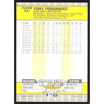 This is a 1989 Fleer Tony Fernandez baseball card. The card is #231 and pictures show condition.