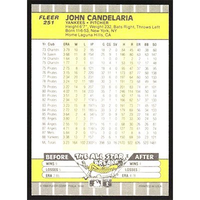 This is a 1989 Fleer John Candelaria baseball card. The card is #251 and pictures show condition.