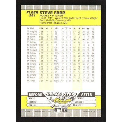 This is a 1989 Fleer Steve Farr baseball card. The card is #281 and pictures show condition.
