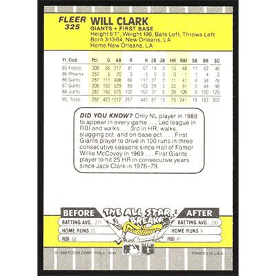 This is a 1989 Fleer Will Clark baseball card. The card is #325 and pictures show condition.