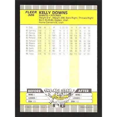 This is a 1989 Fleer Kelly Downs baseball card. The card is #326 and pictures show condition.