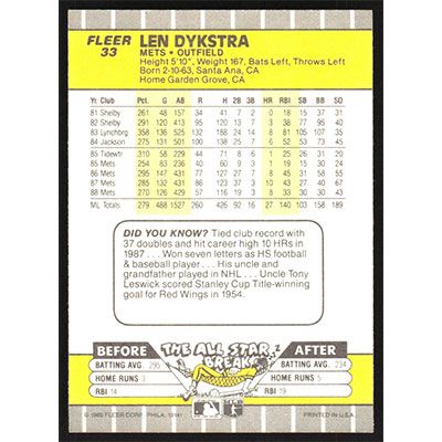 This is a 1989 Fleer Len Dykstra baseball card. The card is #33 and pictures show condition.
