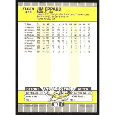 This is a 1989 Fleer Jim Eppard baseball card. The card is #476 and pictures show condition.