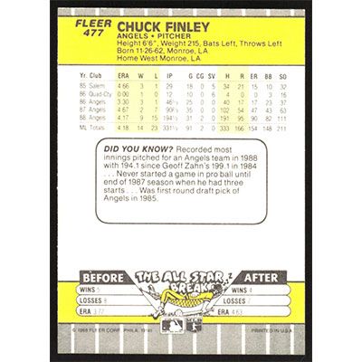 This is a 1989 Fleer Chuck Finley baseball card. The card is #477 and pictures show condition.