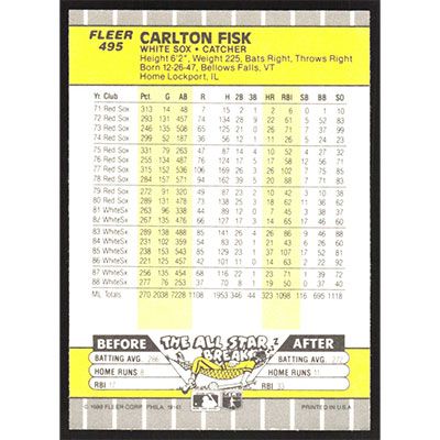 This is a 1989 Fleer Carlton Fisk baseball card. The card is #495 and pictures show condition.