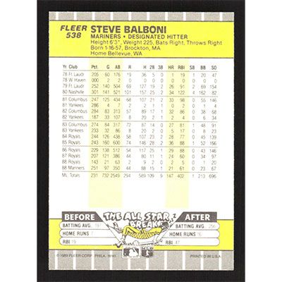 This is a 1989 Fleer Steve Balboni baseball card. The card is #538 and pictures show condition.