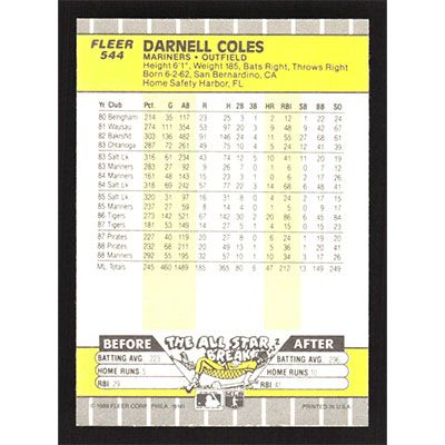 This is a 1989 Fleer Darnell Coles baseball card. The card is #544 and pictures show condition.