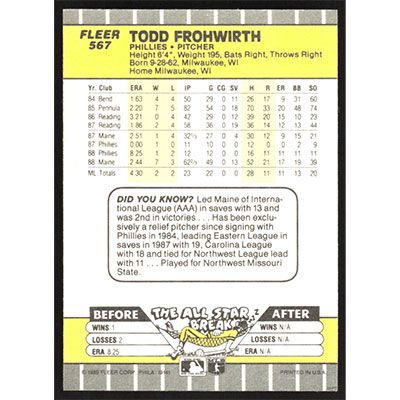 This is a 1989 Fleer Todd Frohwirth baseball card. The card is #567 and pictures show condition.