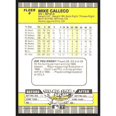 This is a 1989 Fleer Mike Gallego baseball card. The card is #8 and pictures show condition.
