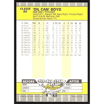 This is a 1989 Fleer Oil Can Boyd baseball card. The card is #82 and pictures show condition.