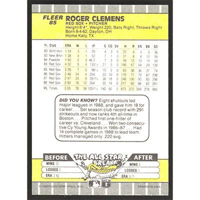 This is a 1989 Fleer Roger Clemens baseball card. The card is #85 and pictures show condition.