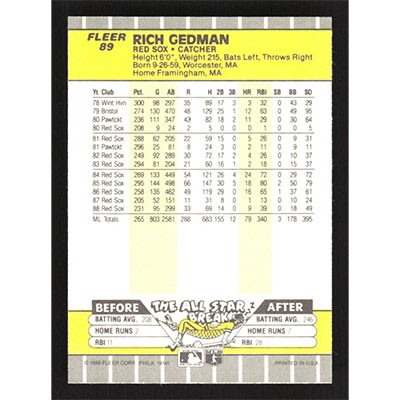 This is a 1989 Fleer Rich Gedman baseball card. The card is #89 and pictures show condition.