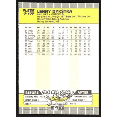 This is a 1989 Fleer Update Lenny Dykstra baseball card. The card is #U-105 and pictures show condition.