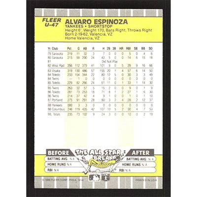 This is a 1989 Fleer Update Alvaro Espinoza baseball card. The card is #U-47 and pictures show condition.