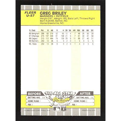This is a 1989 Fleer Update Greg Briley baseball card. The card is #U-57 and pictures show condition.